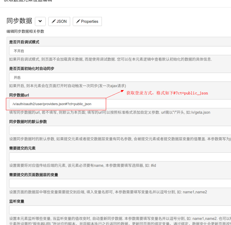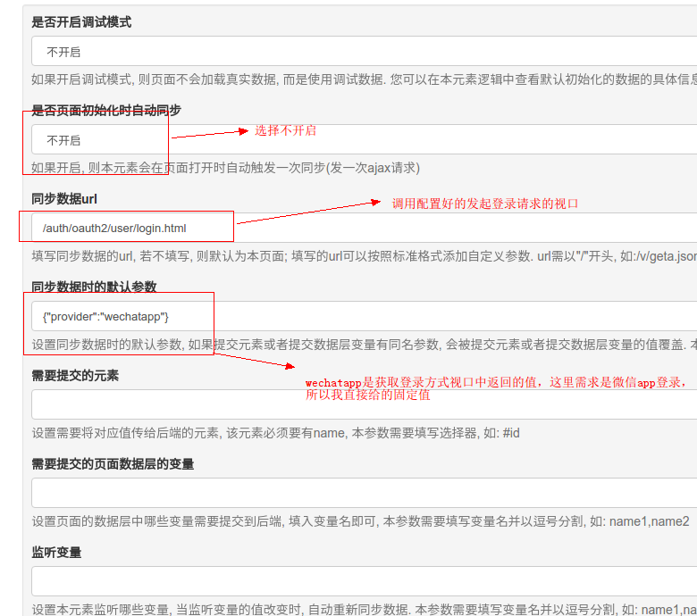 2.在获取数据元素设置里面→ 是否页面初始化时自动同步(不开启)→ 同步数据url(/auth/oauth2/user/login.html)→ 同步数据时的默认参数( {"provider":"wechatapp"}),