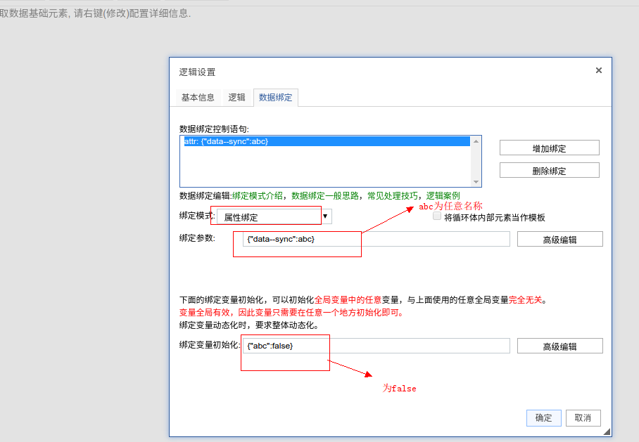 1.添加一个同步数据元素,右键→逻辑→属性绑定→绑定参数为{"data--sync":abc},abc为自己定义的名称