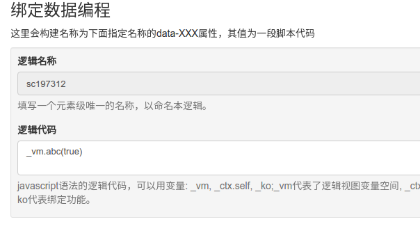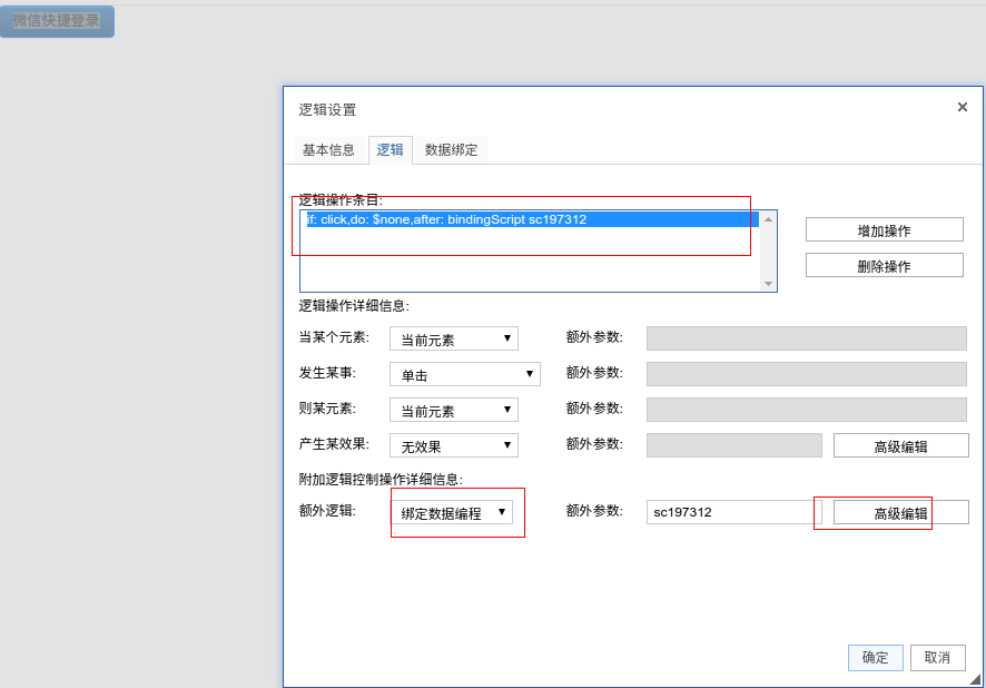 3.在按钮上右键→逻辑,写一个绑定数据编程,额外参数→高级编辑写_vm.abc(true), ——(当点击按钮时触发绑定数据编程,开始调用2中的同步数据元素视口,发起登录请求)