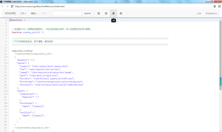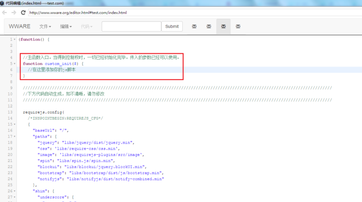 在js页面中的function custom_init($){} 中添加你的js脚本代码,其余的代码请不要修改。在下图红框的位置内添加js脚本。